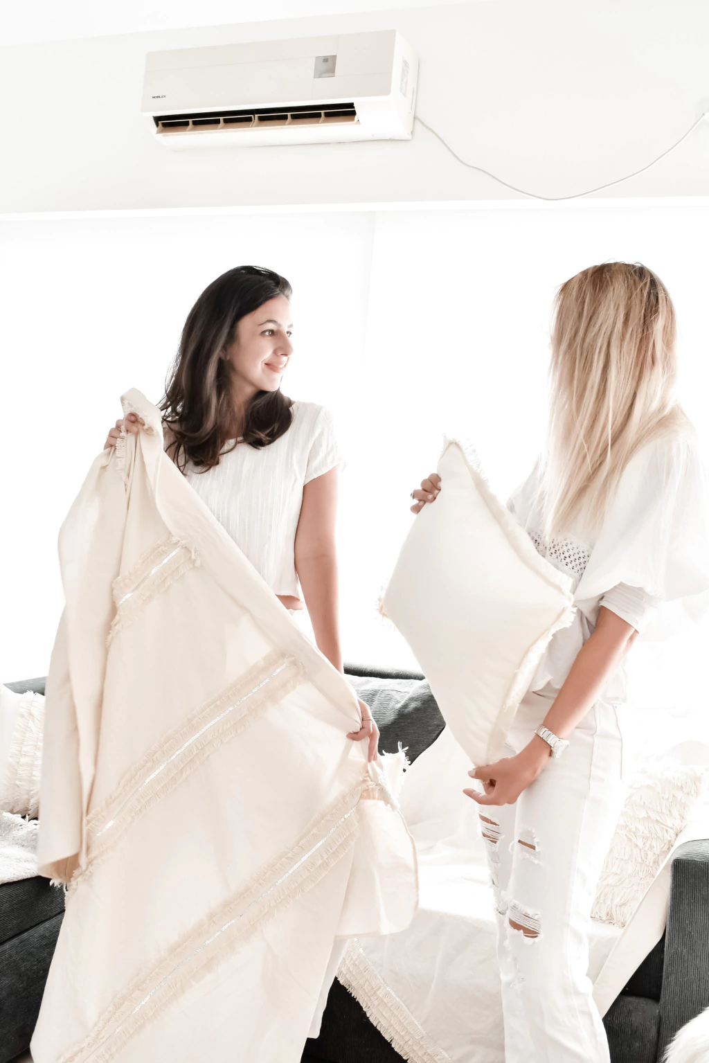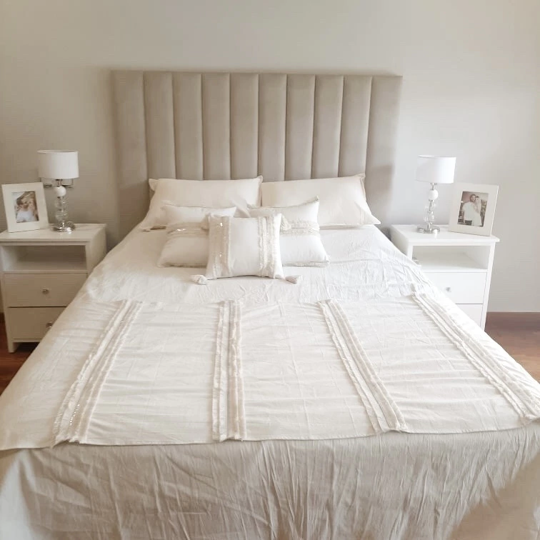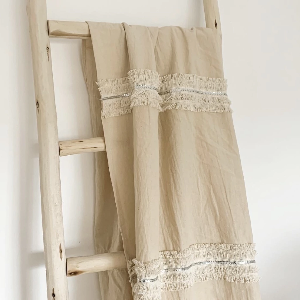 Dale un toque de distinción a tus ambientes con nuestra manta o pie de cama Margot tusor 100% algodón, un textil liviano, suave y con una caída natural que enamora. El detalle especial: flecos de algodón combinados con lentejuelas color plata que aportan un sutil brillo y realzan cualquier espacio con un aire sofisticado y bohemio.